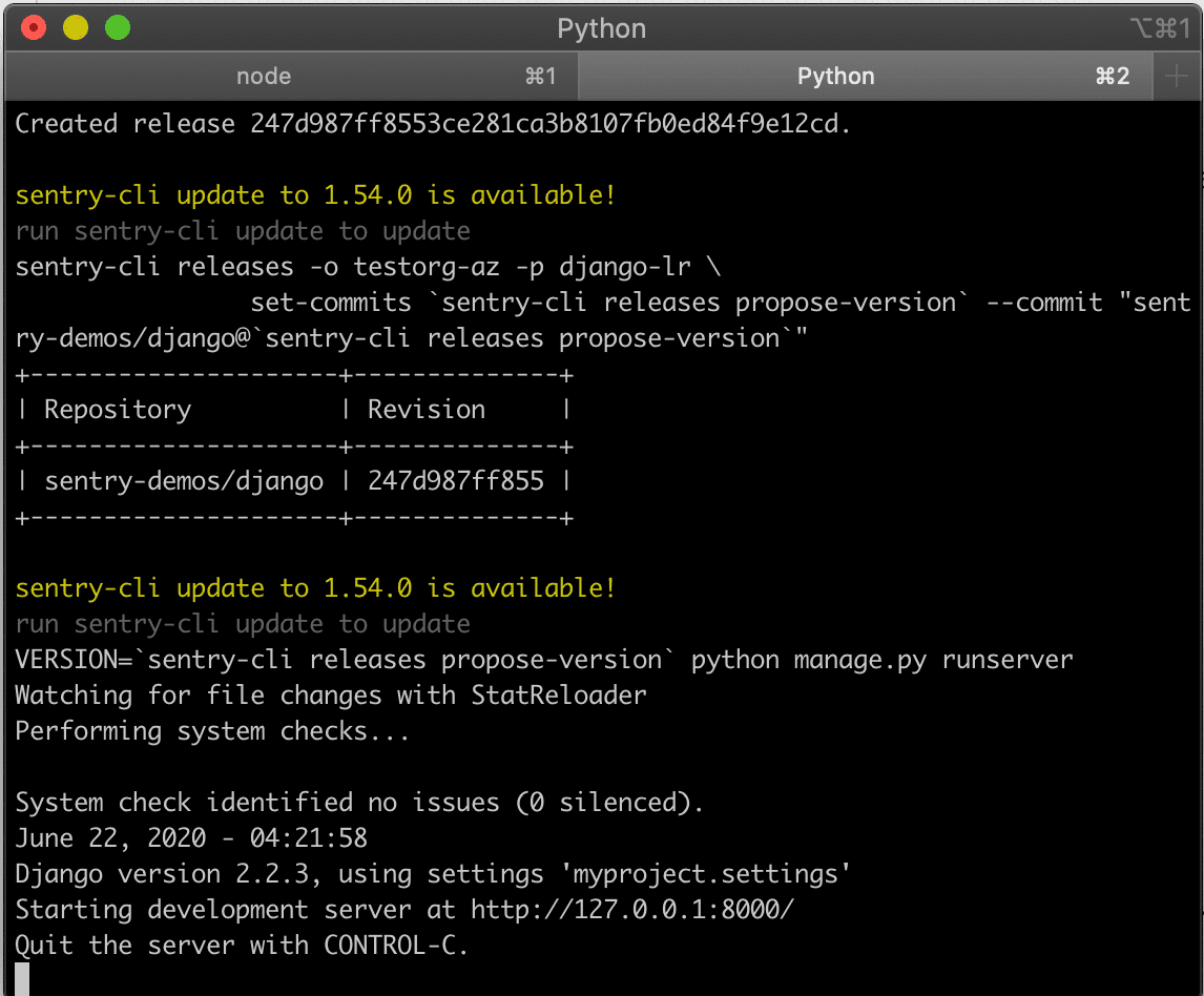 2. Run the following command to install the required Python libraries, set up the Sentry Release, and run the Django server: